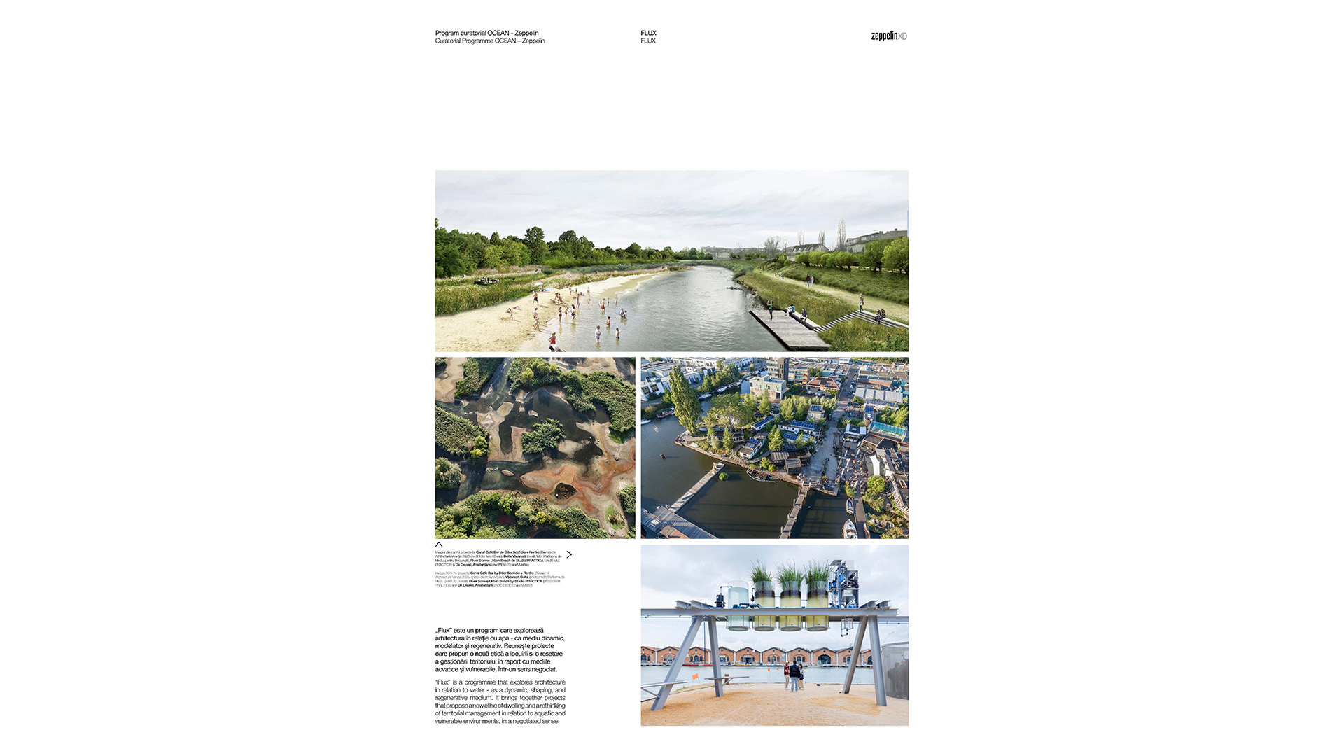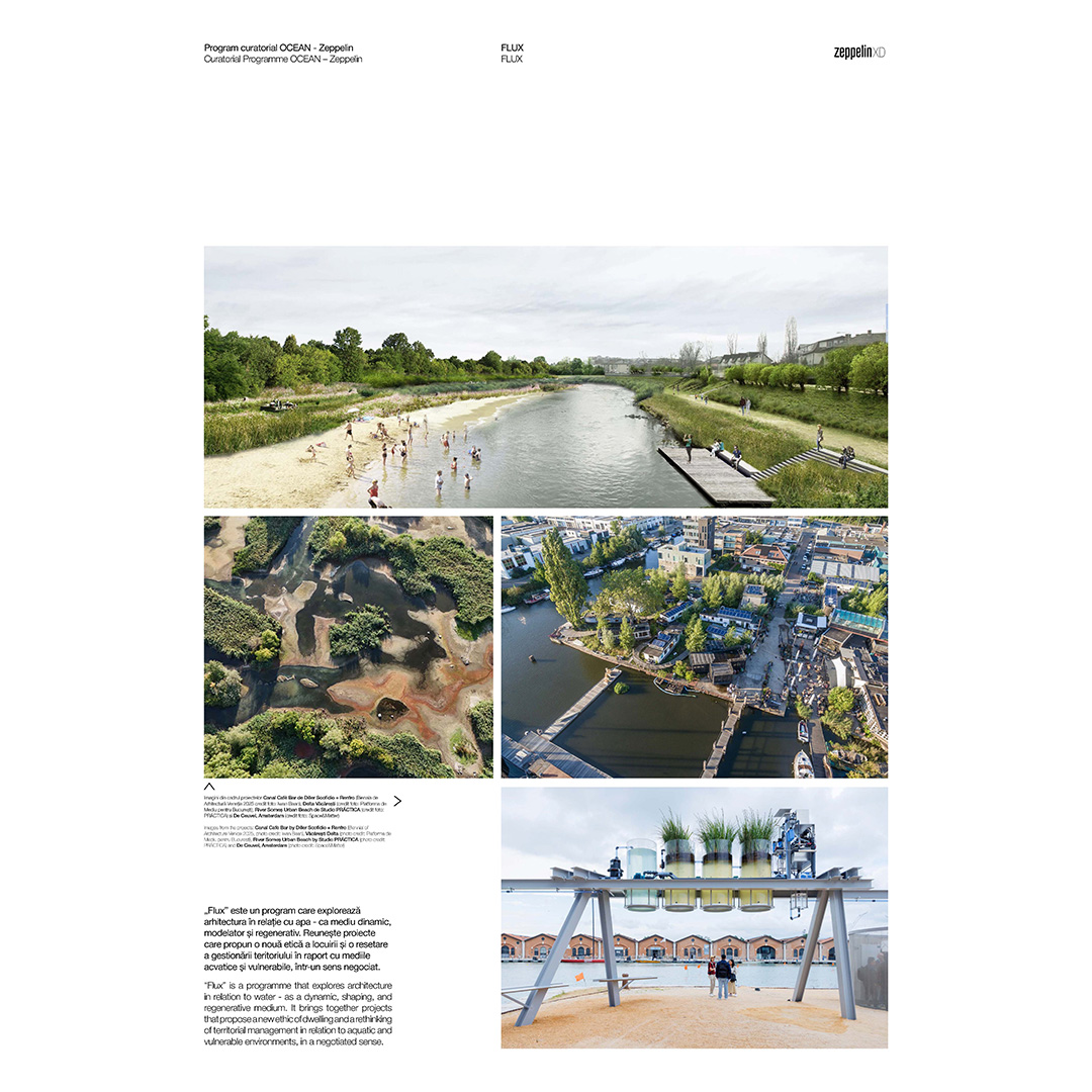 FLUX (2027). Abordează arhitectura ca sistem adaptiv în raport cu apa, eroziunea și teritoriile vulnerabile. Programul reunește proiecte românești și globale despre renaturalizare, infrastructuri ecologice și locuire sensibilă la mediu, punând accent pe cooperare între arhitectură, ecologie și politici urbane.