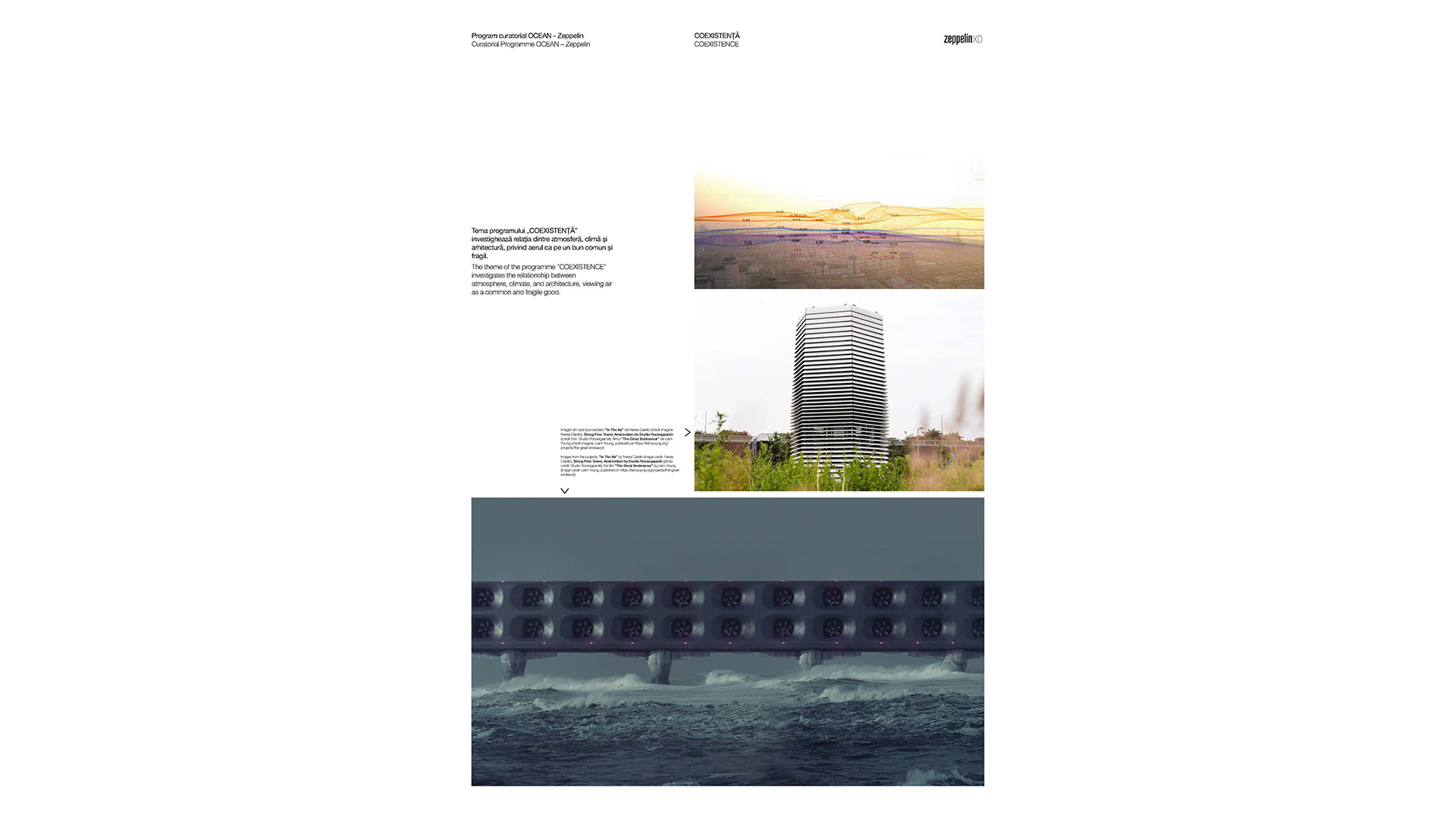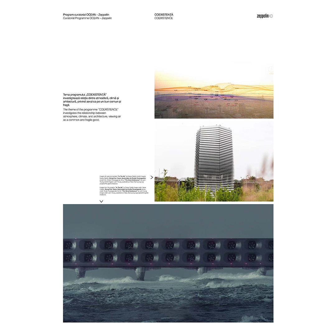 COEXISTENȚĂ (2028). Cercetarea analizează aerul ca bun comun, punând în dialog arhitectura cu climatologia, biodiversitatea și justiția climatică. Proiectele incluse fac vizibile fenomene invizibile precum poluarea, spațiul cosmic sau fluxurile biologice.