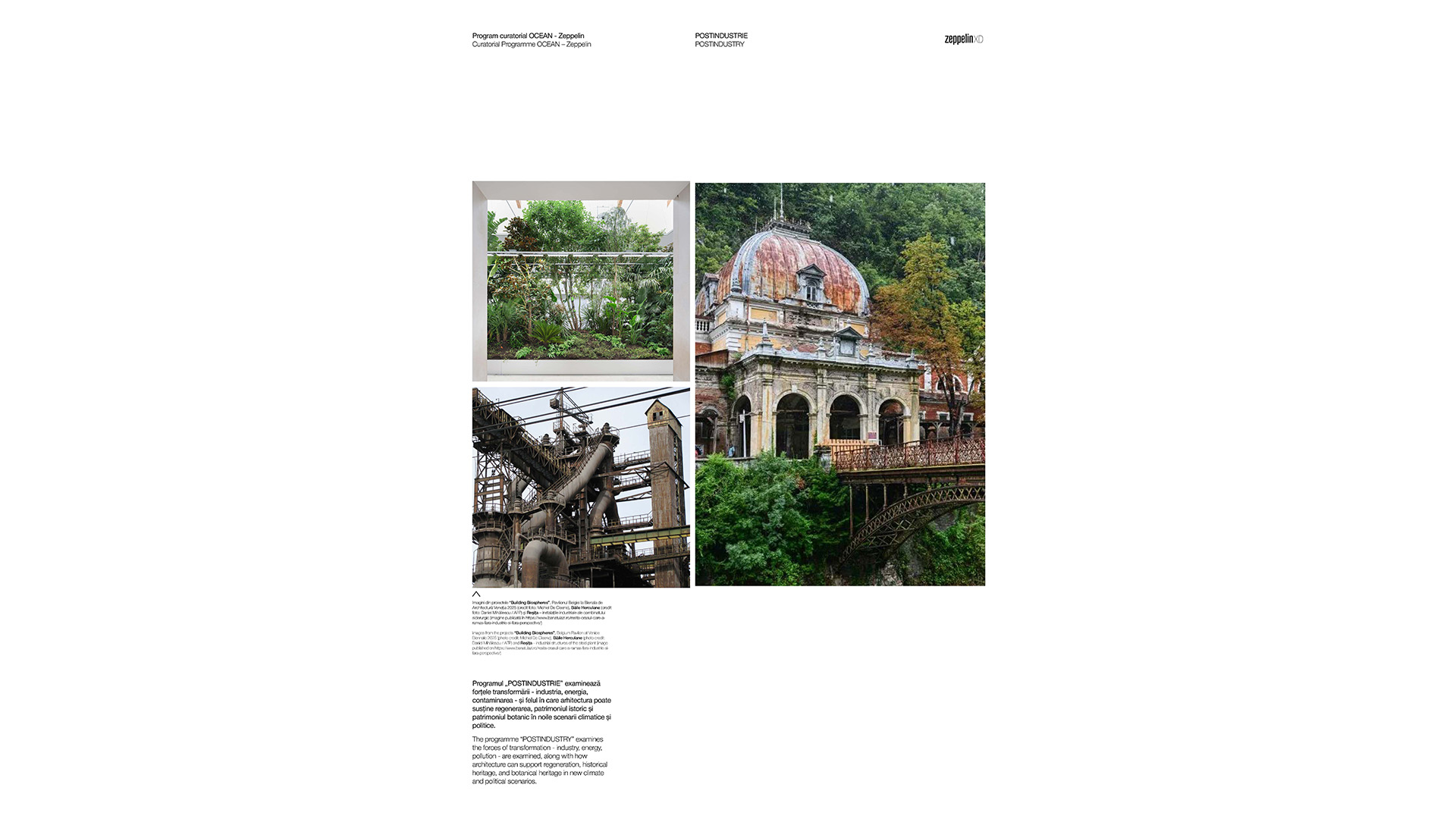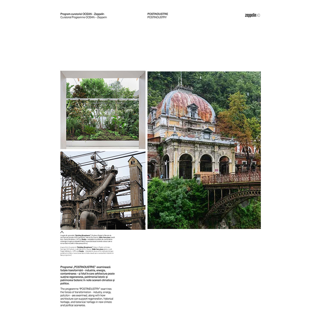 POSTINDUSTRIE (2029). Tema examinează forțele transformării industriale și răspunsurile arhitecturii la noile scenarii climatice și politice. Prezintă regenerări urbane din România și proiecte internaționale din contexte climatice extreme, discutând temperatura ca indicator al supraviețuirii și arhitectura ca agent de reparare.